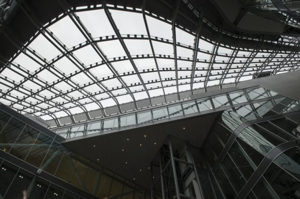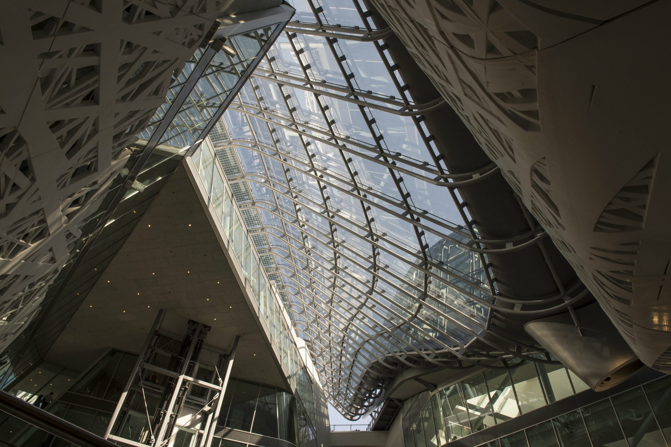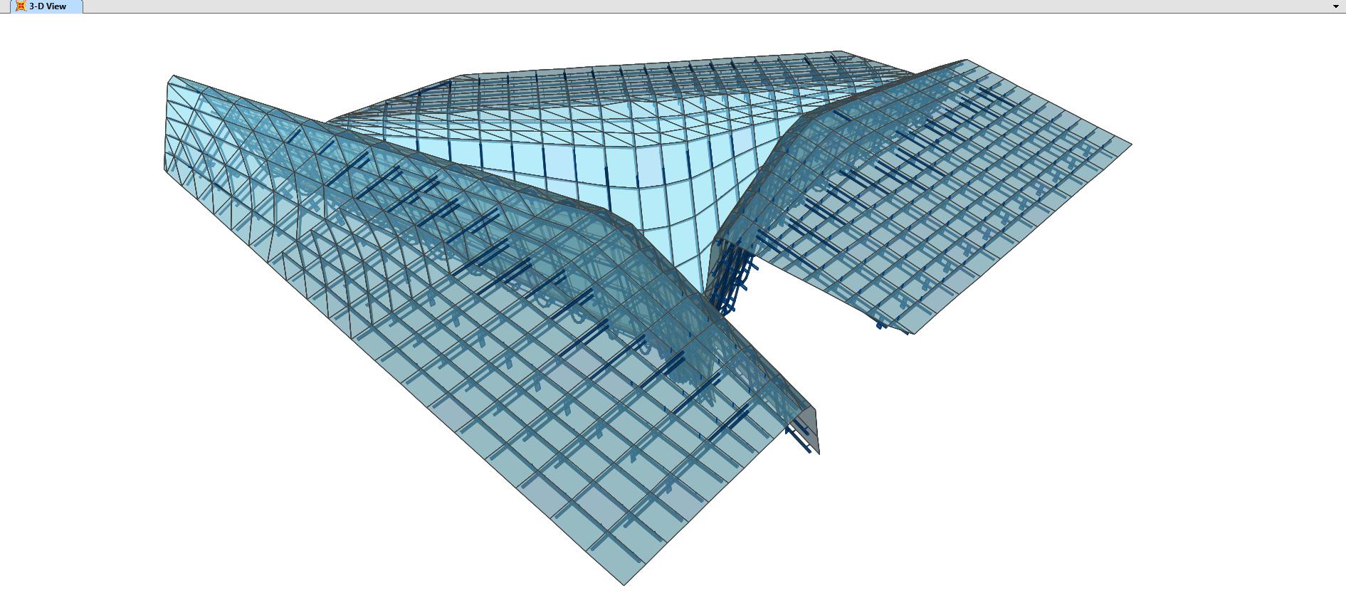 copertura in acciaio-vetro tridimensionale a forma libera con vetri curvati a caldo e a freddo e con fotovoltaico